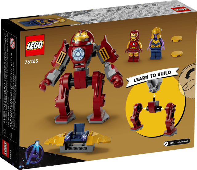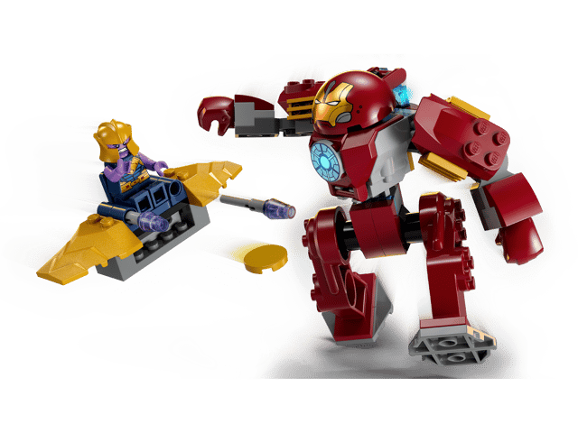 - Battle action – The Hulkbuster mech is fully posable and includes a seat for the Iron Man minifigure. The aircraft has an attached disc shooter and a seat for the Thanos minifigure