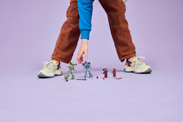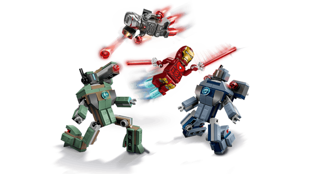 • LEGO® ǀ Marvel minifigures – Includes an Iron Man minifigure with blue hand and feet blasters and laser beam weapons and a War Machine minifigure with red hand and feet blasters and a stud shooter
