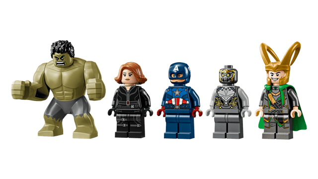 - Marvel characters – A Hulk figure and 4 minifigures: Captain America with his shield, Black Widow with a stud shooter, Loki with his cape and helmet, and a Chitauri warrior with a laser pistol