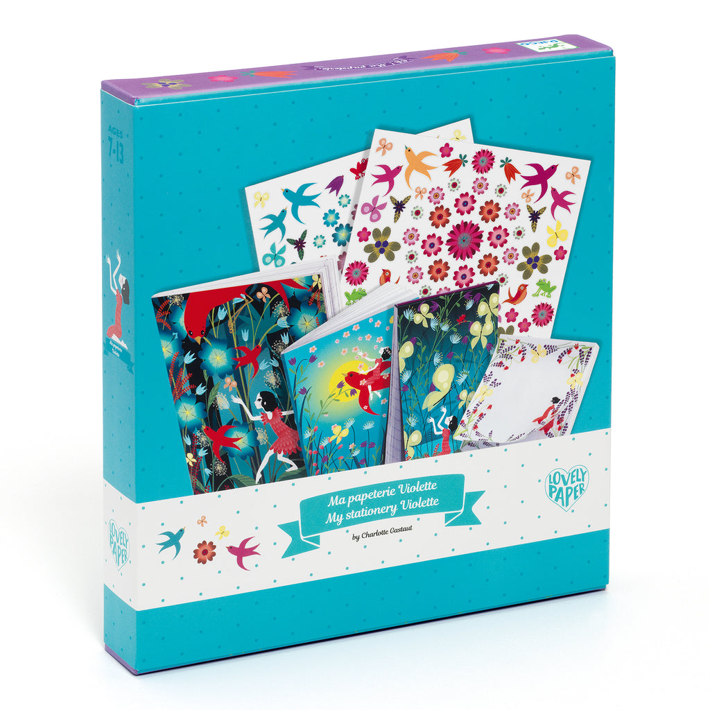 A stationery box with beautiful illustrations. Budding writers will enjoy writing down ideas and thoughts, or drawing and decorating with the stickers. Lovely Paper by Djeco, a collection of refined and delicate stationery with beautiful illustrations to brighten up the daily life of young and old.