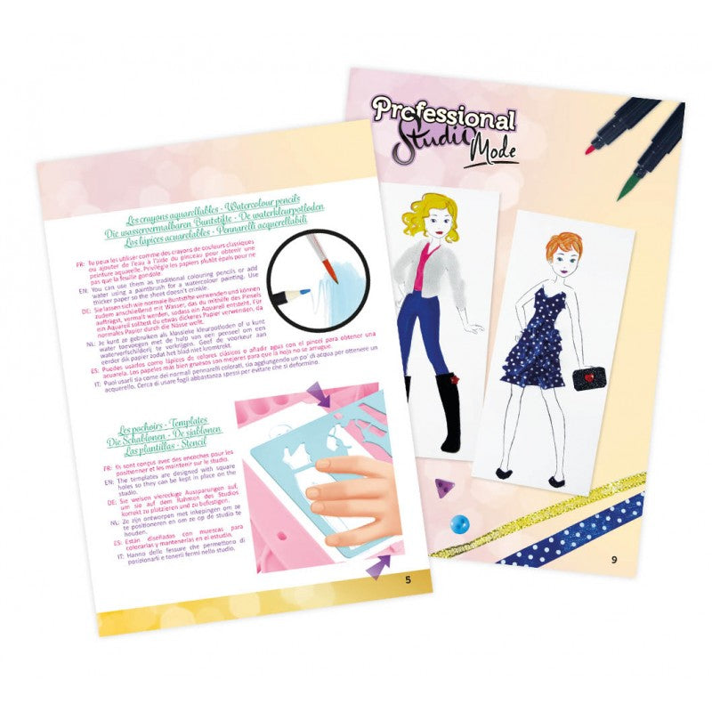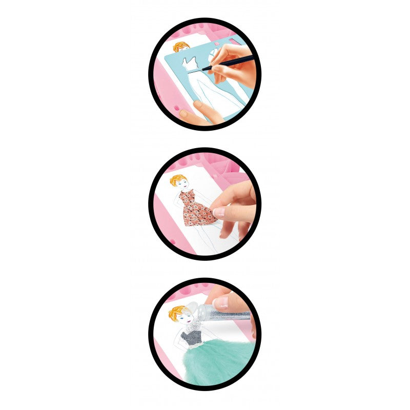 - Place a figure, design outfits with the stencils and then fill them out using the many different accessories included: self-adhesive fabric, feathers, glitter, felt, ribbons, felt-tip pens, watercolour pencils, scissors, a pencil sharpener, and more.