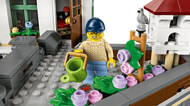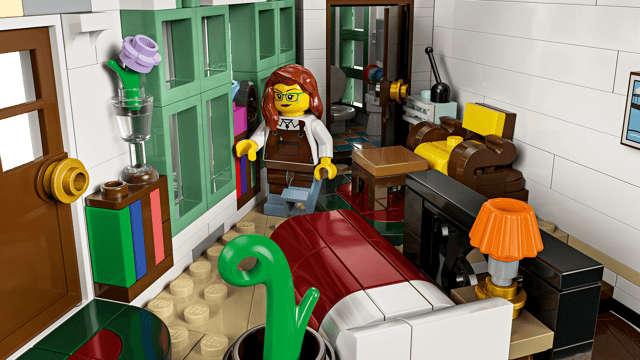 The 3-level building includes a 2-storey music shop with marching-band instruments, and an adjacent furniture shop complete with a counter, stools, table and workshop. The top floor is home to a furnished flat with a bathroom, while a roof garden provides space for potted plants and a pigeon coop. Perfect for home office decor, this model includes 7 minifigures and a modular design with easy access to the interior.