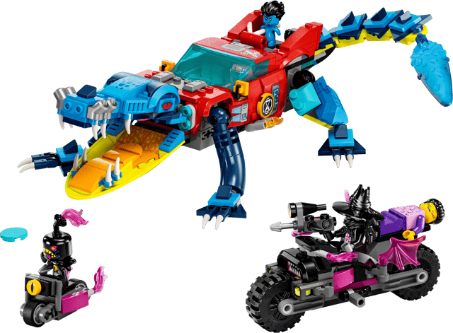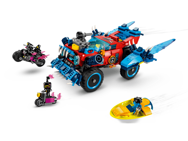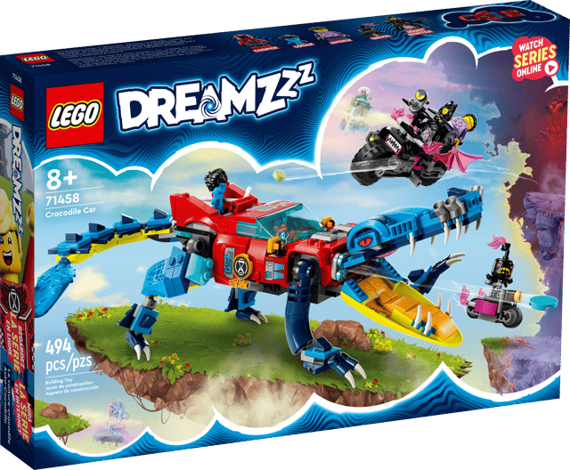Kids aged 8+ speed into the dream world with this LEGO® DREAMZzz™ Crocodile Car (71458) building toy set. Based on the TV show, the set lets kids create an amazing car that will help save Jayden from the scary Night Hunter! 1 set, 2 building options The playset includes 2 building options and lots of story-led instructions, encouraging kids to choose their own adventure and enjoy double the playtime. They can decide to build a crocodile car to fight off the nightmares or a super-fast off-roader and mini-boat to chase them down. In crocodile mode, the vehicle has posable arms and legs and a disc shooter hidden in the front grille so kids can fire discs from the croc’s mouth. In truck mode, the vehicle has rolling wheels and a removable roof so a minifigure can be seated inside. Fantastic minifigures The building toy set includes detailed minifigures of Cooper and Jayden, plus the Night Hunter, who comes with a cool motorcycle toy and an evil helper.