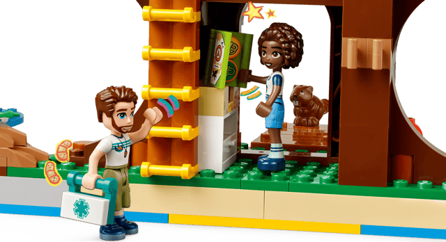 The building set is filled with fun features for creative play and comes with 5 mini-dolls, accessories and lots of animal figures, including 2 beavers who are building a dam. Send the characters whizzing down the zip line or help them navigate the obstacle course with its log bridge, climbing wall and trapdoors. There are also activities like canoeing, plus an island that can be reached by boat or zip line!